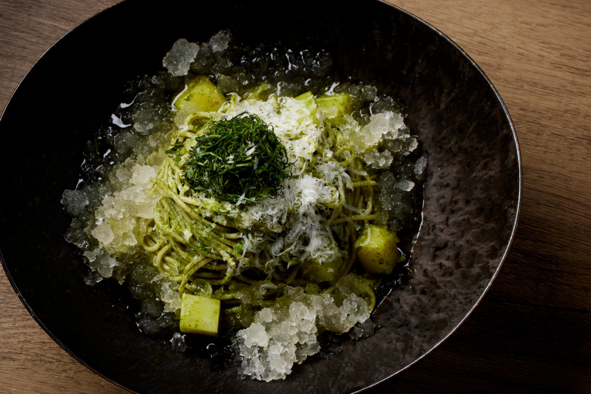 冷製パスタならではの氷を散りばめますが、この氷はこぶ出汁を氷付けにしたもの。