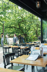 日常と非日常が交差したモダンな店内席に加え、目黒川を一望できるバルコニー席はラタン調のカップルシート。